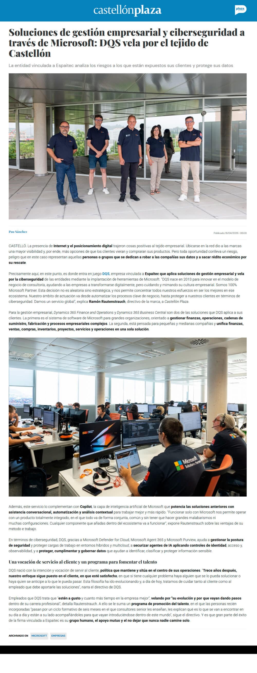 Puedes encontrar el artículo completo en Castellón Plaza: «Soluciones de gestión empresarial y ciberseguridad a través de Microsoft«.