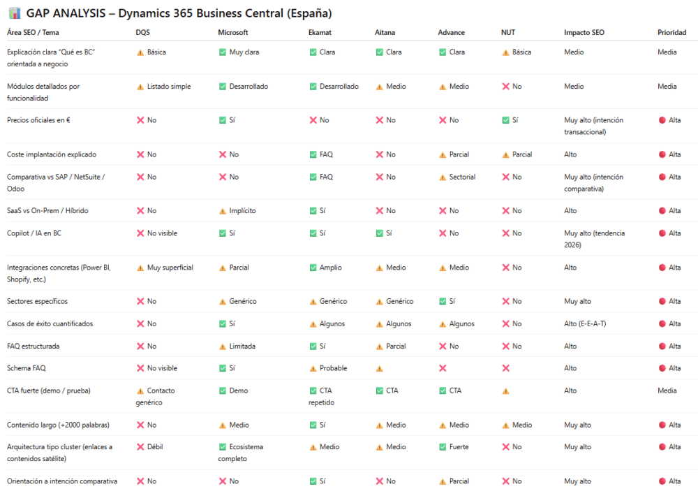 Include the analysis of the competitors that you consider relevant and the ones that are ranking in Google on first page. Create a table with a GAP analysis with all these competitors.