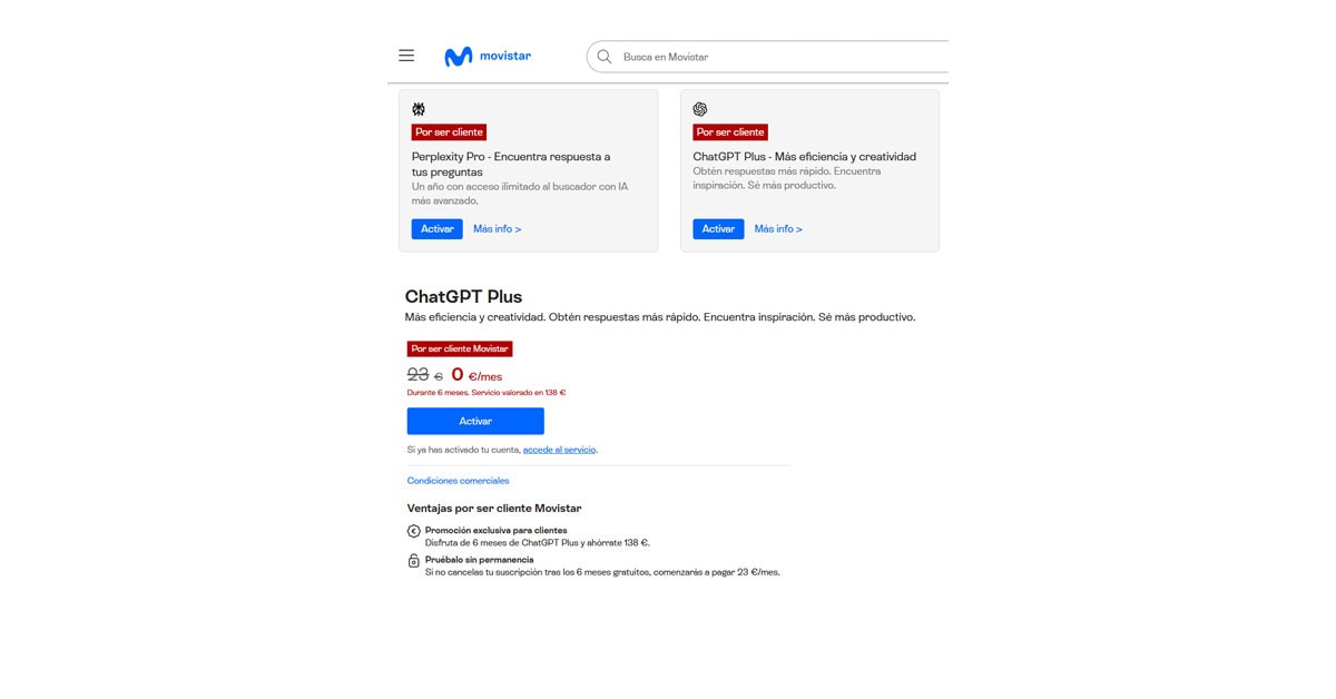 Hoy tengo una buena noticia para los clientes de Movistar (no prepago y no empresa) ya que pueden canjear 6 meses de ChatGPT Plus de forma gratuita (un ahorro de 138 EUR – 23 EUR/mes durante 6 meses).