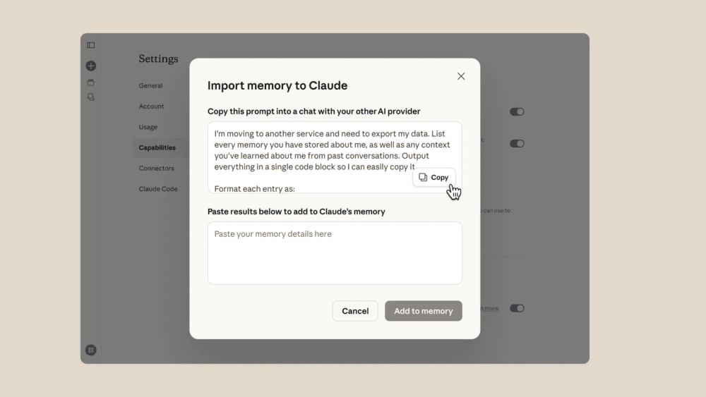Con Import Memory, puedes trasladar a Claude la información que tu asistente anterior ha ido “aprendiendo” sobre ti con un flujo muy simple: generar un volcado de memoria en tu IA actual, copiarlo y pegarlo en la configuración de memoria de Claude.