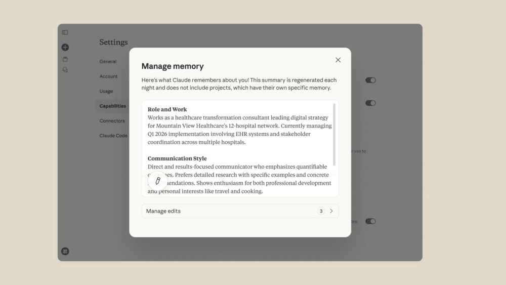Claude transforma lo pegado en “edits” que puedes revisar desde la gestión de memoria. Además, puede tardar hasta 24 horas en reflejarse completamente.