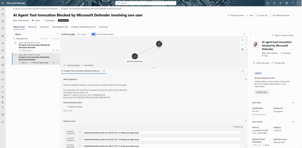 Los ataques actuales son dirigidos y de múltiples etapas. Cuando Defender detiene una actividad riesgosa de un agente de Copilot Studio en tiempo de ejecución, genera una alerta y comienza a correlacionar señales relacionadas en correo electrónico, dispositivos, identidades, aplicaciones y la nube en un único incidente. Esto construye la narrativa completa del ataque, a menudo antes de que alguien revise la cola, para que el SOC (Centro de Operaciones de Seguridad) pueda ver cómo están siendo atacados y qué hacer a continuación.