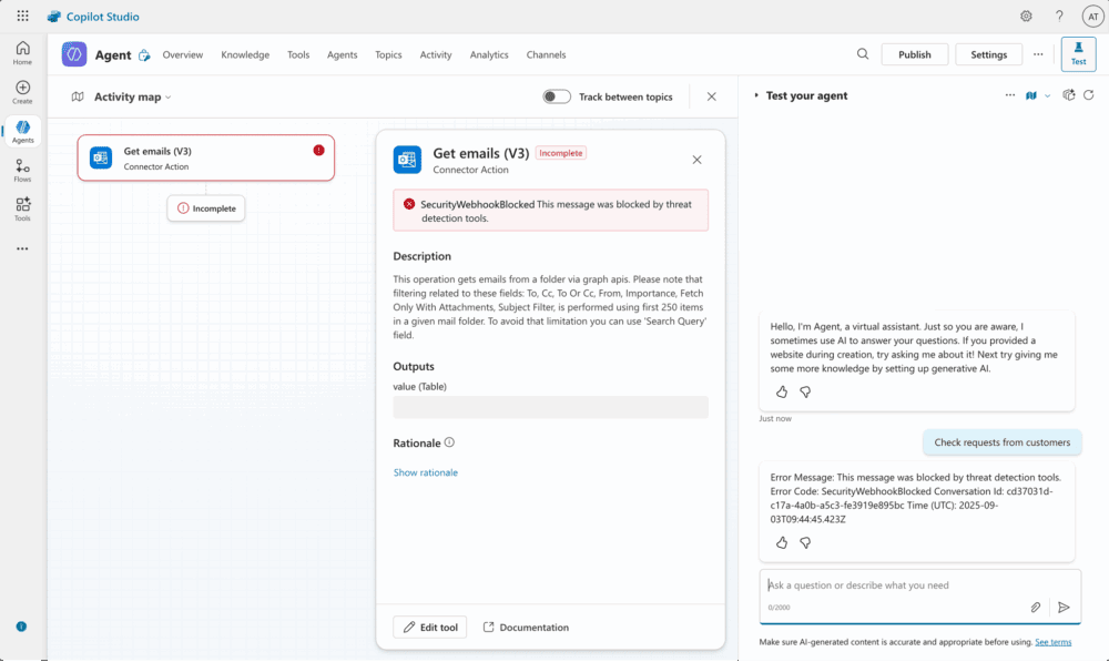 La nueva protección en tiempo real para agentes creados con Copilot Studio añade una red de seguridad en el momento más crítico: cuando el agente está en funcionamiento. Ayuda a proteger a los agentes durante su operación, reduciendo la probabilidad de que entradas maliciosas los exploten.